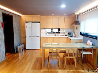 도착하자마자 내부로 들어갔더니 사장님이 보일러를 틀어 놓으셔서 아주 따뜻했어요.< 넓은 주방과 거실, 전자레인지, 정수기도 있어서 물은 따로 가져오지 않았습니다.