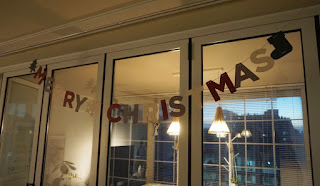 아까 트리 상자를 찾으면서 찾은 메리 크리스마스 갈랜드도 이보다 늦기 전에 붙여 주었습니다.