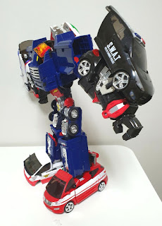 5대의 차량 중 4대는 팔과 다리이며, 중간에 있는 큰 차는 단독으로 변신할 수 있는 엑시안트 스톰이라는 로봇입니다!